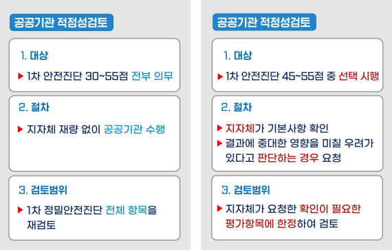 이에 따라 조건부 재건축 범위는 현행 30~55점에서 45~55점으로 완화되고, 기존 30점 이하만 가능했던 즉시 재건축은 45점 이하로 대폭 늘어나게 됐다. 또 조건부 재건축 시 의무적으로 추진해야 하는 공공기관의 적정성 검토도 지자체 요청이 있을 때만 예외적으로 시행하도록 간소화했다.