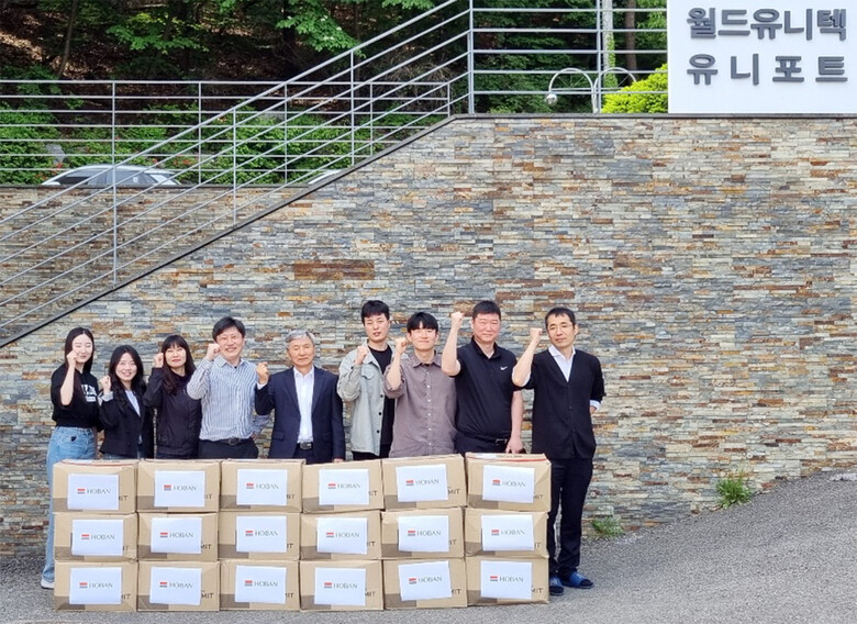 | ▲호반그룹, 근로자의 날을 맞아 협력사 근로자에 감사의 선물 전달 사진. 호반프라퍼티의 아브뉴프랑 협력사인 월드유니텍 임직원 모습<사진제공=호반그룹> |