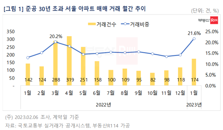 부동산R114(www.r114.com)가 국토교통부 실거래가 자료를 분석한 결과, 2023년 1월 거래된 서울 아파트 805건 가운데 174건(21.6%)이 준공 30년을 초과한 구축으로 조사됐다. 구축 매매 거래는 지난 2022년 대선 전후 재건축 규제 완화 기대감으로 반짝 늘었으나, 고금리와 부동산 시장 침체 등의 영향으로 다시 저조해졌다. 올해 1월 전방위적 규제 완화책이 발표된 후 거래 증가가 두드러졌는데, 30일간의 신고 기간을 감안하면 거래건수는 더 늘어날 것으로 보인다.