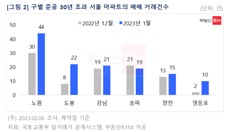 올해 1월 준공 30년 초과 서울 아파트의 매매 거래건수는 △노원 44건 △도봉 22건 △강남 21건 △송파 19건 △양천 15건 △영등포 10건 순으로 집계됐다. 노원과 도봉의 거래 증가가 두드러졌는데, 토지거래허가구역으로 묶여 있지 않고 특례보금자리론 대상이 되는 9억원 이하 주택이 많아 상대적으로 거래가 용이했던 것으로 분석된다.