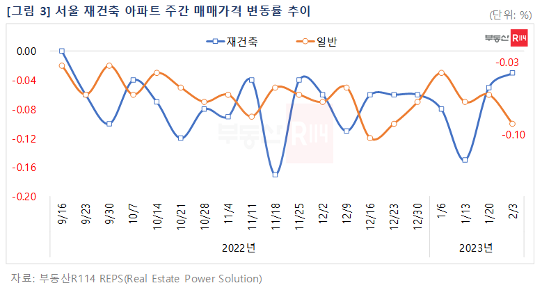 대부분 재건축 사업이 추진 중인 준공 30년 초과 구축 아파트 거래가 늘면서 재건축 아파트의 가격 하락폭도 둔화되는 모습이다. 2월 3일 기준 서울 재건축 아파트 주간 매매가격은 0.03% 내려, 2022년 9월(9/16, 0.00%) 이후 가장 낙폭이 둔화됐다.
