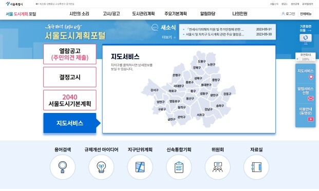 서울도시계획포털은 시내 25개 자치구를 포함해 서울시의 도시계획 정보를 제공하는 사이트다. 서울도시기본계획을 포함해 용도지역·지구·구역 등 도시관리계획, 신속통합기획(정비지원계획) 등 정보를 확인할 수 있으며, 도시관리계획 고시·공고 등에 대한 주민 의견 제출도 가능하다.