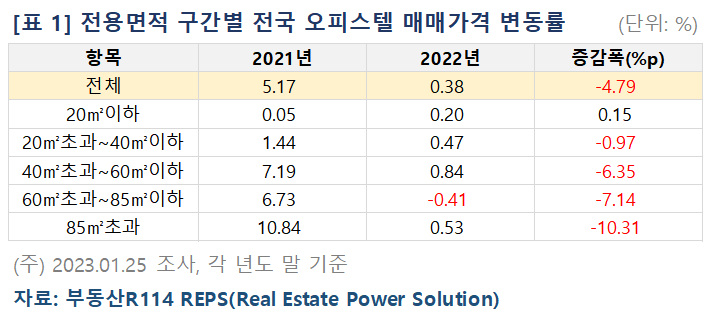 오피스텔 매매 거래량은 가격 등락에도 영향을 미친 것으로 나타났다. 2022년 전국 오피스텔 매매가격 변동률은 0.38%로 2021년 5.17%에 비해 4.79%p 둔화됐다. 특히 60㎡초과~85㎡이하의 가격은 0.41% 내려 2013년(-0.26%) 이후 처음으로 하락 전환했다. 매매가격 변동률 증감폭은 전용면적이 큰 구간에서 더 많이 하향 조정됐는데, 거래가 늘어난 전용 20㎡이하 구간은 소폭 올랐다.
