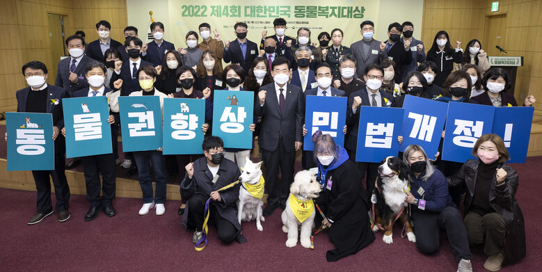 | ▲김진표 국회의장(사진 가운데)외 대한민국 동물복지대상 수상자가 단체사진을 찍고 있다.<사진제공=포스코건설> |