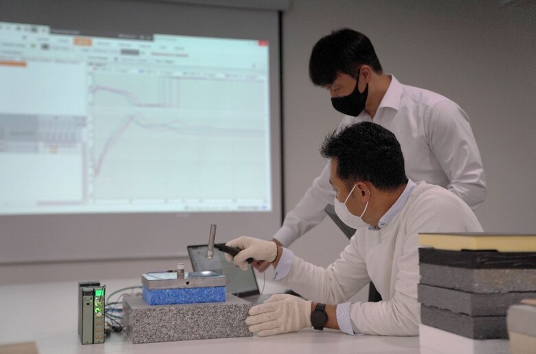 | ▲롯데건설 관계자가 층간완충재 실험결과를 확인하고 있는 모습<사진제공=롯데건설> |