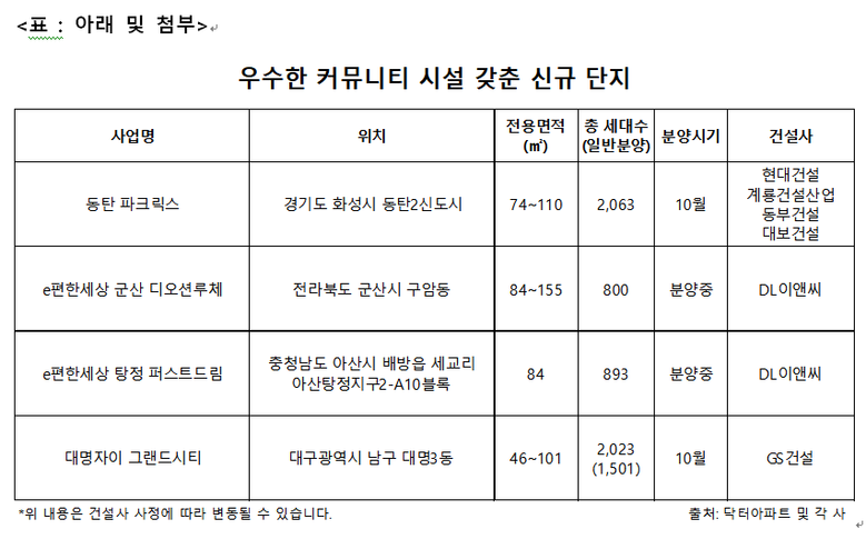 올 연말 우수한 커뮤니티 시설을 갖춘 신규 분양 단지는 다음과 같다. 현대건설·계룡건설산업·동부건설·대보건설은 10월 경기도 화성시 동탄2신도시 신주거문화타운에 ‘동탄 파크릭스’를 분양할 예정이다. 단지는 총 4개 블록, 지하 2층~지상 20층, 44개 동, 전용면적 74~110㎡ 공동주택 총 2,063세대로 조성되며 이 중 A51-1블록, A51-2블록, A52블록 공동주택 1,403세대를 1차로 분양할 예정이다. 단지는 대규모로 조성되는 만큼 다양한 커뮤니티 시설이 들어선다. 각 블록별로 피트니스센터, 실내골프연습장, 작은도서관, 어린이집, 맘스스테이션 등이 조성될 예정이다. 아울러 A51-1블록에는 스카이라운지, A51-2블록에는 트램펄린, 클라이밍, A52블록에는 다함께돌봄센터, 키즈놀이터, 온가족라운지 등의 특화 커뮤니티가 들어선다.