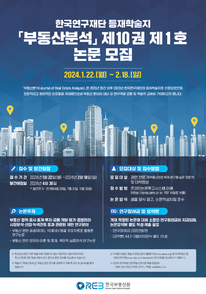 논문은 온라인논문투고시스템(https://ejrea.jams.or.kr)을 통해 접수 가능하며, 자세한 사항은 부동산분석 홈페이지(www.ejrea.org) 또는 한국부동산원 부동산연구원 홈페이지(www.reb.or.kr/research) 공지사항을 참조하면 된다.