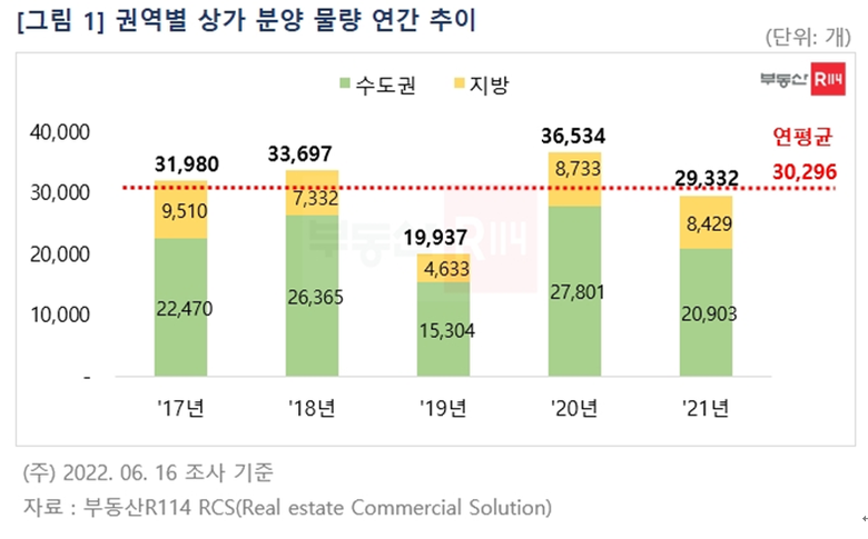 부동산R114의 상업용 부동산 분석 솔루션 'RCS(Real estate Commercial Solution)'에서 제공하는 상가 분양데이터를 분석한 결과, 최근 5년(2017~2021년) 전국에서 연평균 3만296개의 상가가 분양됐다. 권역별로 수도권의 연평균 상가 분양물량은 2만2,569개(74.5%)로, 지방 7,727개(25.5%) 대비 3배가량 많았다. 인구 및 업무시설이 밀집한 수도권에 상가 쏠림이 나타나면서 지방과의 생활편의시설 격차가 더욱 확대될 것으로 예상된다.