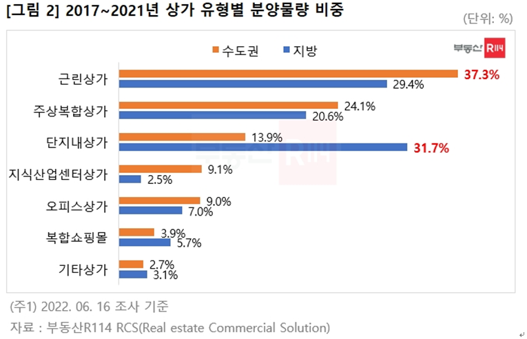 권역별로 분양상가의 유형은 차이를 나타냈다. 신도시 및 택지지구가 많은 수도권에서는 근린상가의 분양 비중이 37.3%(전체 11만2,843개 중 4만2,040개)로 가장 높았다. 서울 마곡지구를 비롯해 경기 화성 · 시흥 · 남양주 · 평택 · 하남, 인천 서구 · 중구 등에서 근린상가의 분양이 많았다. 반면 지방은 단지내상가의 분양 비중이 31.7%(전체 3만8,637개 중 1만2,251개)로 가장 컸다. 부산, 대구, 경남, 충남 등 최근 5년간 아파트 분양이 많았던 지역 위주로 단지내상가 공급 비중이 높았다.