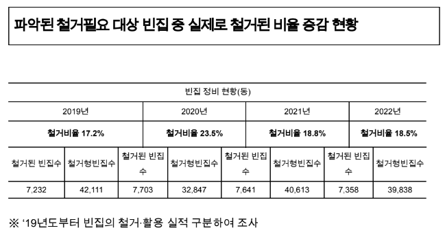 빈집 철거 비율 18%, 빈집 활용 비율 0.7%대로 5년째 제자리걸음 수준