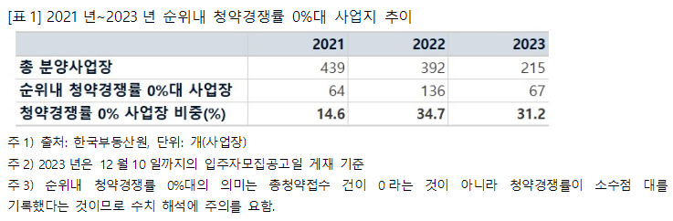 아파트 분양시장은 전국에 쌓인 5만 8,299호(2023년 10월 기준)의 미분양 적체 외에도 자금조달을 담당하고 있는 PF대출 냉각 문제가 지속되고 있다. 과거보다 낮아진 시세차익 기대 저하로 청약통장 사용에 신중한 분양 대기수요의 움직임이 사업지별 양극화의 원인이 되고 있다. 고분양가 외에도 중도금 대출이자 부담이 만만치 않은 상황이라 당분간 분양시장의 청약 쏠림과 수요자의 냉철한 청약선택이 순위내 청약경쟁률 0%대 사업지를 속출 시킬 전망이다.