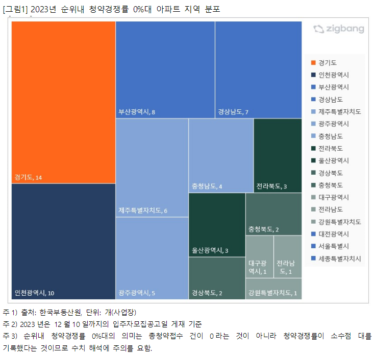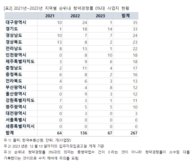 반면 서울특별시, 대전광역시는 순위내 청약경쟁률 0%대 사업지가 연내 발생되지 않았고 세종특별자치시는 2023년내 분양한 곳이 없었다.