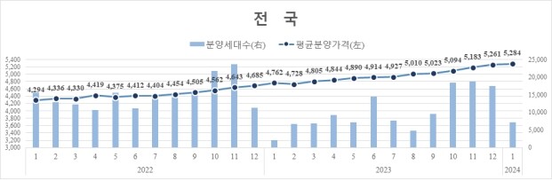 | ▲2024년 1월 전국 민간아파트 평균 분양가격과 신규분양세대수 추이. 그래픽=HUG 제공 |