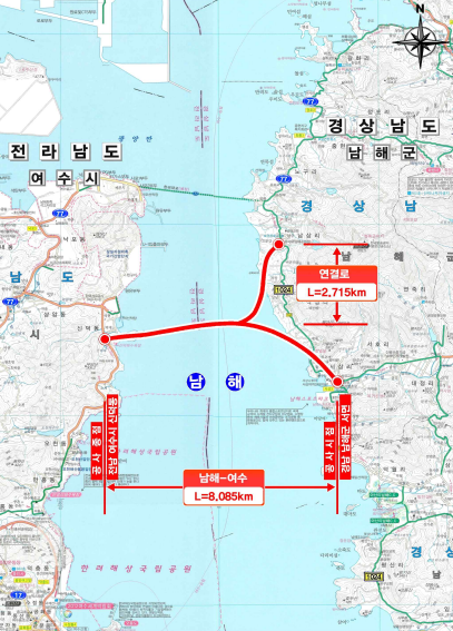남해~여수 해저터널 건설사업은 전라남도 여수시 신석동에서 경상남도 남해군 서면까지 영호남을 연결하는 총 8085㎞(해저터널 5.76㎞) 4차로 국도를 신설하는 사업이다. 국비 6974억원이 투입된다.