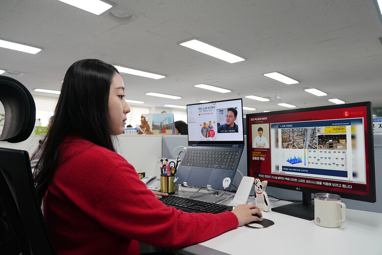 | ▲롯데건설 직원이 사내 유튜브 채널을 통해 ‘혁신Award행사’에 참여하고 있다,<사진제공=롯데건설> |
