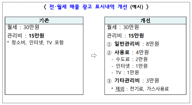 국토부는 이에 전・월세 매물 광고 시 월별로 10만원 이상의 금액이 부과되는 정액 관리비에 대해서는 부과내역을 세분화해 표시하도록 하고 온라인 중개플랫폼에도 표준화된 입력 기능을 마련해 임차인이 해당 매물의 관리비 부과 내역 등 정보를 명확히 확인할 수 있도록 할 방침이다.