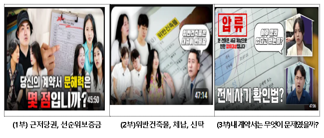 교육 영상은 총 3부로, 5가지 대표 전세사기 유형을 중심으로 전문가들이 실제 빌라(다세대‧다가구주택) 전세계약 체결 과정을 지켜보면서 위험요인이나 놓치기 쉬운 사항들을 진단하는 관찰 프로그램 형식으로 제작됐다.