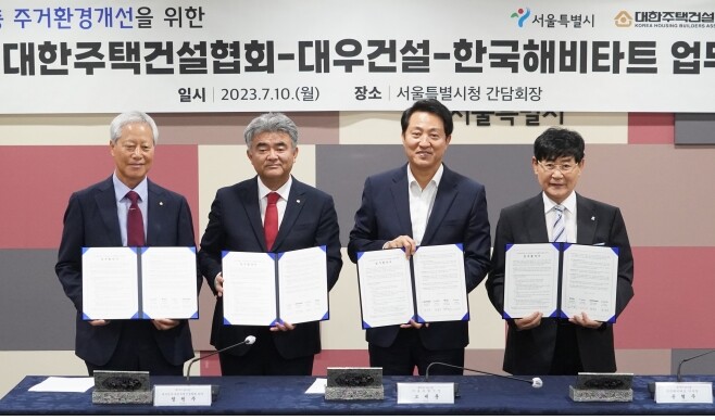 시는 이를 위해 10일 오전 서울시청에서 대한주택건설협회·대우건설·해비타트와 '주거취약계층 주거환경개선을 위한 4자 간 업무협약'을 체결했다고 밝혔다.