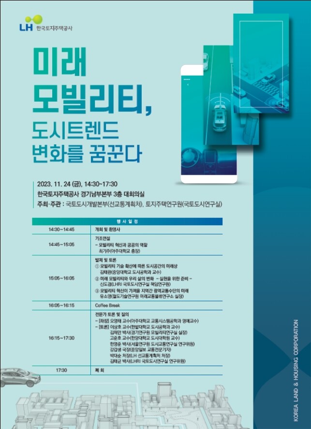 한국토지주택공사(LH)는 오는 24일 경기남부지역본부에서 '미래 모빌리티, 도시트렌드 변화를 꿈꾼다'를 주제로 미래교통 콘퍼런스를 연다고 23일 밝혔다.