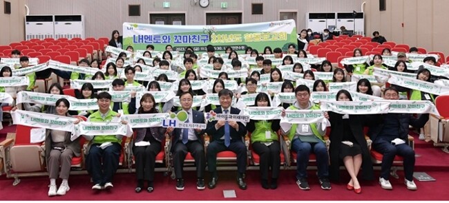 | ▲신홍길 LH주거서비스처장(앞줄 왼쪽 네 번째), 김병기 아이들과미래재단 본부장(앞줄 왼쪽 다섯 번째) 등이 LH 멘토들과 기념촬영을 하는 모습. 사진=LH 제공 |