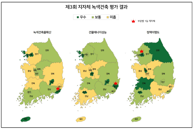 이번 평가에서는 '녹색건축물 확산' 부문에서 부산광역시가, '건물에너지 선능' 부문에서 울산광역시가, '정책 이행도' 부문에서 서울특별시가 최우수 지자체로 선정됐다. 최우수 사례로는 서울시의 '유리커트월 가이드라인'이 뽑혔다.