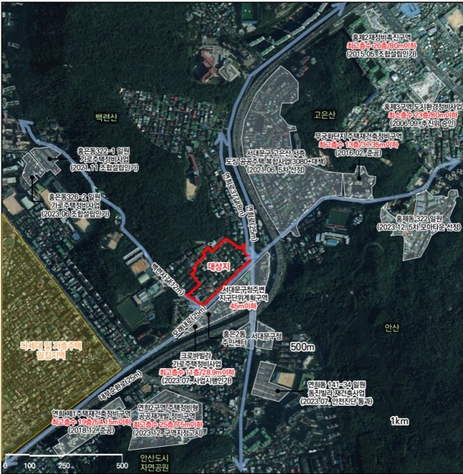 이에 따라 서대문구청과 백련상 근린공원 주변에 위치한 서대문구 홍은동 277-45번지 일대에는 아파트 7개동과 공공임대주택 40세대를 포함한 614세대가 들어설 예정이다.