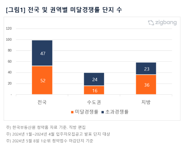 올해 청약을 나선 단지 중 절반 이상의 단지가 청약 경쟁률 미달을 나타냈다. 직방 조사에 따르면 올해 총 99개 단지가 1순위 청약접수를 진행한 가운데 이 중 52개 단지의 1순위 평균 청약경쟁률이 1대 1에 미치지 못했다. 특히 52개 단지 중 69%(36개 단지)가 지방에서 공급되었으며 지역별로는 울산(0.2대1), 강원(0.2대1), 대전(0.4대1), 경남(0.4대1), 부산(0.8대1)이 저조한 청약성적을 나타냈다.