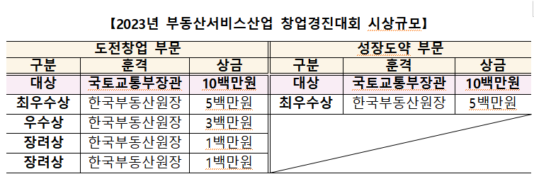 이번 대회는 참가자의 역량과 사업영위기간 등을 고려해 <도전창업> 부문과 <성장도약> 부문으로 구분되며, 최종 입상팀(7팀)에게는 국토교통부장관상, 한국부동산원장상과 총 상금 3천 5백만원(대상 1천만원)이 지급된다.