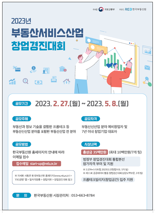 '2023년 부동산서비스산업 창업경진대회'에 대한 자세한 내용은 한국부동산원 누리집(www.reb.or.kr)을 통해 확인하거나 한국부동산원 시장관리처(☎053-663-8784)로 문의하면 된다.