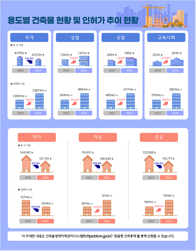 전국 건축물 연면적은 43억1498만7000㎡로 전년 대비 2.1% 증가했다. 이 가운데 주거용 건물이 46.1%로 가장 컸고, 상업용(22.1%), 공업용(11.1%), 교육·사회용(8.9%)이 뒤를 이었다.
