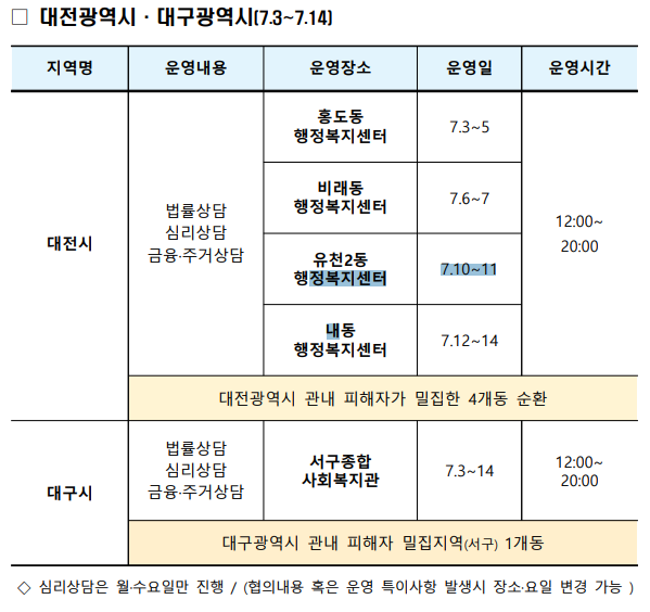 앞으로는 대전시와 대구시에서 다음달 3일부터 14일까지 각 2주간 찾아가는 상담 서비스를 운영할 예정이다.