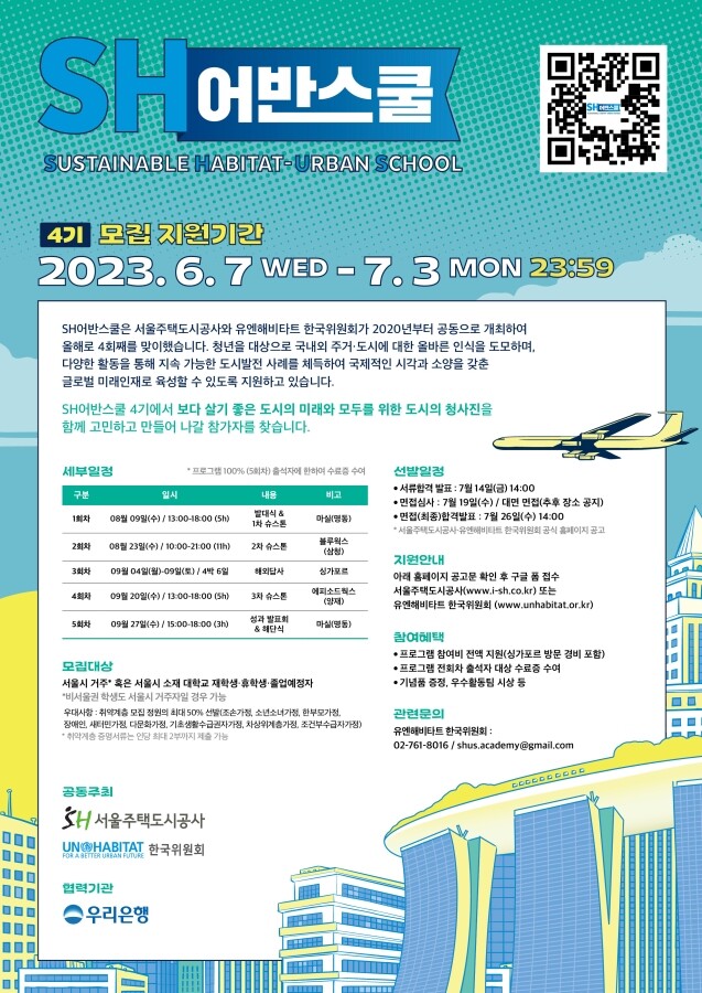 서울주택도시공사(SH공사)는 유엔해비타트 한국위원회와 주거·도시 분야 글로벌 인재로 성장할 수 있도록 지원하는 'SH어반스쿨' 4기 대학생 참가자를 다음달 3일까지 모집한다고 7일 밝혔다.