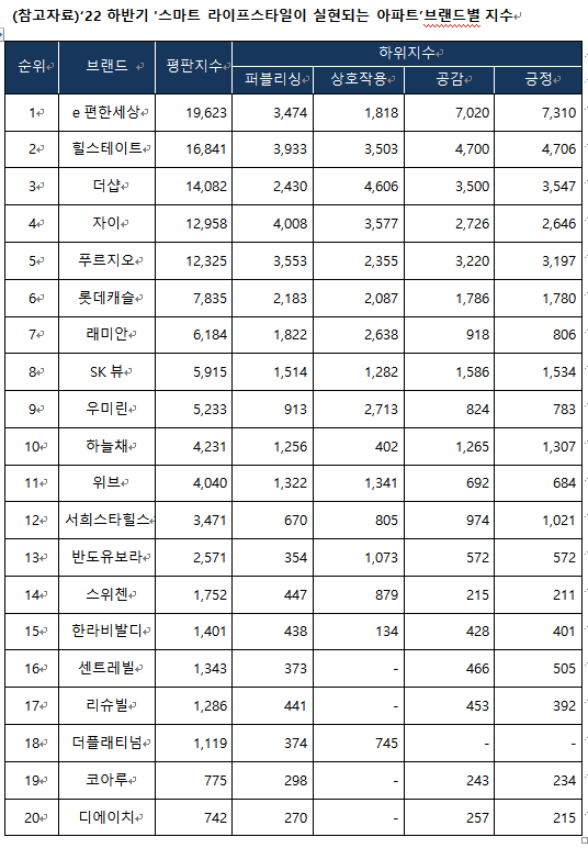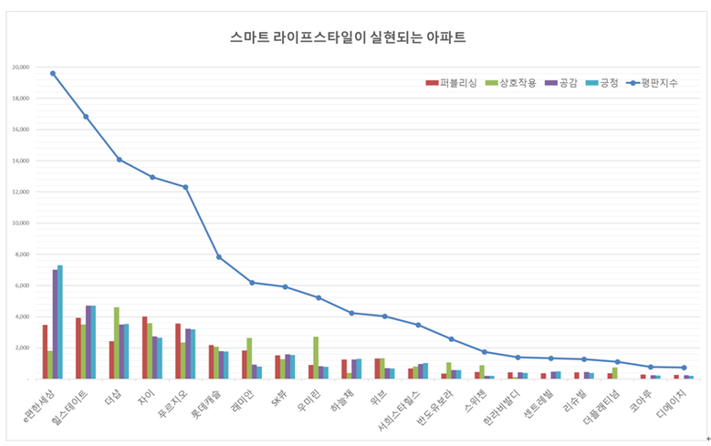 비즈빅데이터연구소는 스마트 기술이 라이프스타일에 미치는 실질적인 효용성을 반영한 브랜드 선호도를 분석하기 위해 뉴스, 블로그, 카페, 인스타그램, 트위터 등 소셜미디어 상의 관련 콘텐츠를 파악하여 콘텐츠 퍼블리싱, 상호작용, 공감, 긍정 언급을 기초로 각 지수들을 산출하고 이를 종합하였다. 국내 주요 아파트 브랜드 20개를 분석한 결과 DL이앤씨 e편한세상이 1위, 현대건설 힐스테이트가 2위, 포스코더샵이 3위, GS건설자이가 4위를 차지했으며 푸르지오, 롯데캐슬, 래미안 등이 뒤를 이었다.