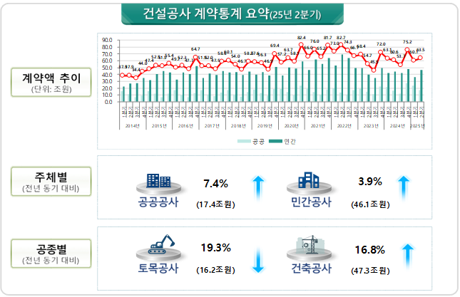 29일 국토교통부가 발표한 ‘2025년 2분기 건설공사 계약 현황’에 따르면 공공 부문 계약액은 전년 동기 대비 7.4% 늘어난 17조4000억 원, 민간 부문은 3.9% 증가한 46조1000억 원이었다.