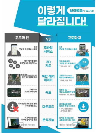 브이월드 고도화 계획은 ▲3차원(3D)지도 등 고정밀 공간정보 확대 ▲모바일3D지도 기능 등 사용자 중심 활용기능 확충 ▲공간정보 코디네이터 등활용지원 강화 ▲클라우드 전환 등 전산인프라 운영환경 개선 등을 담았다.