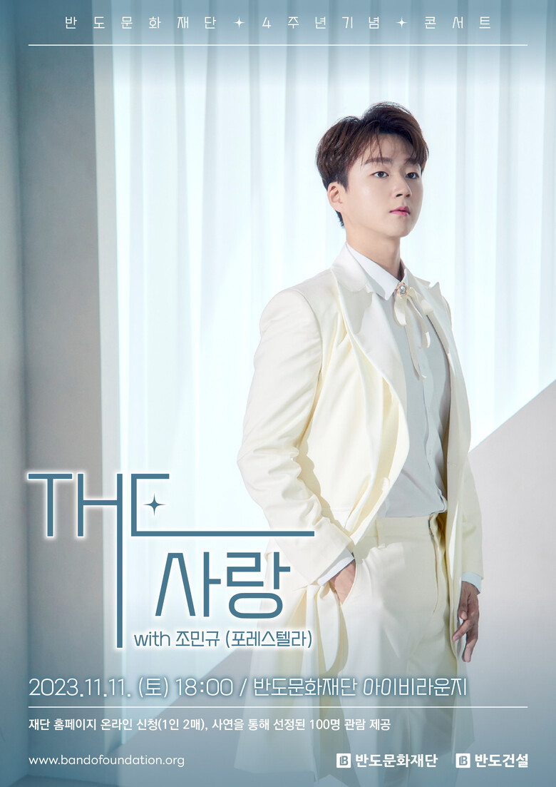 반도건설이 설립한 반도문화재단은 개관 4주년을 맞아 오는 11월 11일, 오후 6시 동탄2신도시 ‘동탄역 반도유보라 아이비파크8.0’ 단지 내에 위치한 재단 아이비라운지에서‘테너 조민규(포레스텔라)의