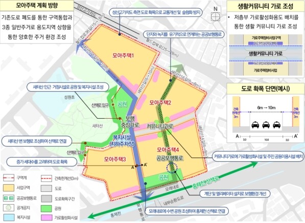 모아타운 관리계획에는 새터산과 홍제천 등 연접한 자연환경을 적극적으로 활용해 새터산변 공원 조성과 홍제천변 수변 공원 조성, 공원으로 접근하는 보행로 확보, 건축특화계획 및 특화가로 조성을 계획해 매력있는 주거단지를 조성하고 인접 지역의 정주 여건까지도 개선될 수 있도록 했다.
