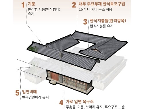 한옥 구조의 필수 5개 항목은 ▲지붕(한식형 지붕) ▲내부 주요부재 한식목조구법(15개 내 기타 구조 허용) ▲한식 지붕틀 ▲가로 입면 목구조 ▲입면 비례 등을이다.