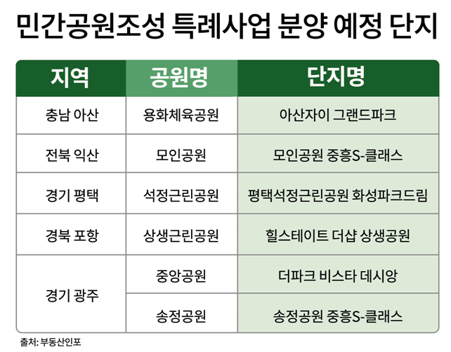 이 외에도 연내 광주광역시에서도 송암공원, 마륵공원, 일곡공원, 운암산 근린공원 등 4곳이 분양을 계획하고 있으며, 경북 구미시에서도 구미꽃동산 민간공원 특례사업을 통해 신규 단지가 공급된다.