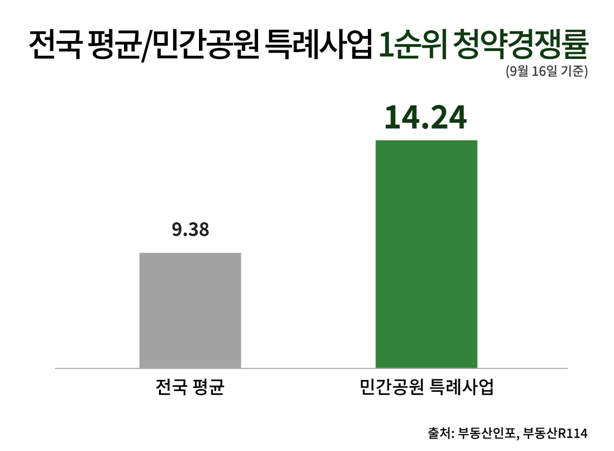 같은 기간 전국 1순위 평균 청약경쟁률이 9.38대 1인 것과 비교하면 약 1.5배 높은 수준이다. 전국 경쟁률은 지난해 2021년 19.32대 1에서 올해 한 자릿수로 낮아졌으나, 민간공원 특례사업 분양 단지는 지난해에 이어 올해도 두 자릿수를 유지하는 모습이다.