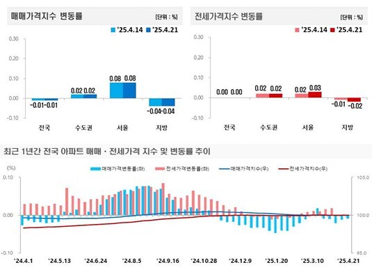 [한국건설경제뉴스=이병훈 기자] 한국부동산원이 24일 발표한 2025년 4월 3주 전국 주간 아파트가격 동향에 따르면, 서울을 비롯한 수도권은 소폭 상승세를 이어간 반면, 지방 시장은 하락세가 지속되며 지역별 온도차가 더욱 뚜렷해졌다.