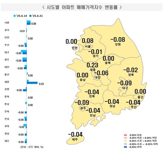 반면 세종시는 고운·다정동 위주로 상승세를 보이며 0.23% 상승, 전주 대비 상승폭이 확대됐다. 세종은 정주여건 양호, 수요 안정 지역을 중심으로 회복 조짐을 나타냈다.