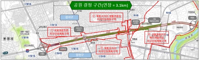 이번 계획안은 국회대로 지하화에 따라 지상부인 신강초등학교 입구~시립 목동청소년센터 구간을 공원으로 조성하는 사업의 하나로, 공원조성구간에 걸쳐있는 4개 지구단위계획구역 안에 8만3994㎡ 공원을 도시계획시설로 도로와 중복 결정하는 내용을 담았다.