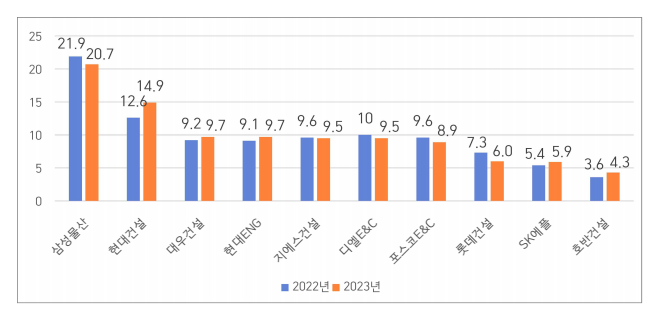 반면 디엘이앤씨(9조5496억원)와 포스코이앤씨(8조9924억원)는 순위가 3계단씩 떨어져 각각 6위와 7위를 기록했다.