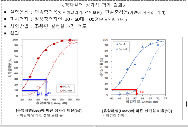 실제 환경부 산하 기관인 한국환경공단이 2019년 12월부터 2020년 6월까지 20~60대 국민 100명을 대상으로 '실생활 층간소음 노출 성가심 반응 연구'를 실시한 결과 현 주간 층간소음 기준(1분 등가소음도)인 43dB에서는 청감 실험 대상자의 30%가 ‘매우 성가심’을 느끼는 것으로 조사됐다.