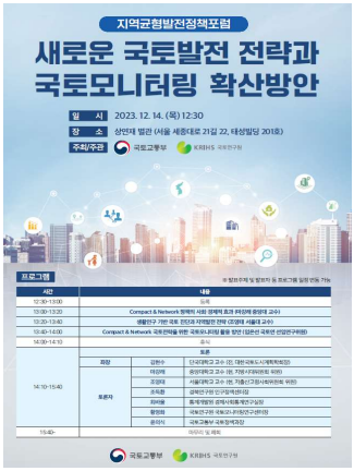 이 세미나는 국토연구원이 '새로운 국토발전전략과 국토모니터링 확산방안'을 주제로 정책방향을 제안하고, 국토부·지자체·학계·연구원 및 공공기관 등이 지방의 자생력을 높일 수 있는 실효성 있는 균형발전 정책방향에 대해 토론하기 위해 마련됐다.