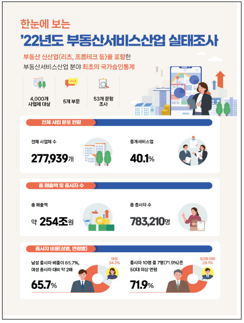 2022년 국내 부동산서비스산업 전체 사업체가 벌어들인 연간 총 매출액이 254조원에 이르는 것으로 나타났다.