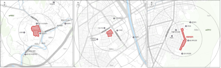 | ▲휴먼타운 2.0 시범사업지 3개소 위치도(왼쪽부터종로구 신영동 214번지·구로구 구로동 85-29번지·중랑구 망우동 422-1번지 일대) 사진=서울시 제공 |