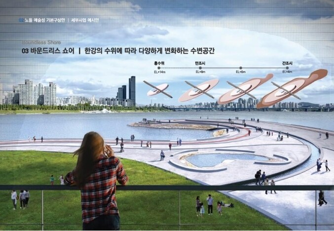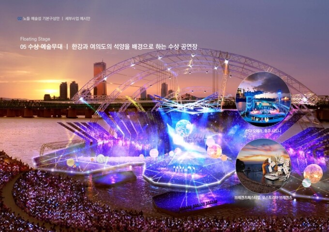 예술섬의 콘셉트에 맞게 디자인을 개선하고, 노들섬 동-서측을 연결하면서 한강의 석양을 360도 조망할 수 있는 전망대와 보행교를 신설하고, 한강을 배경으로 한 수상예술무대도 새롭게 마련할 예정이다.