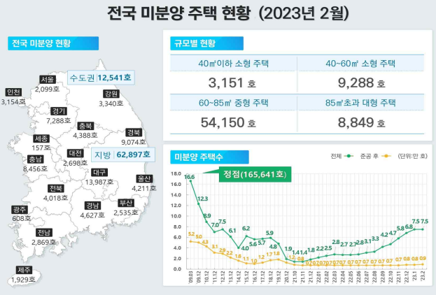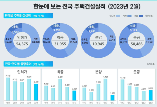 주택 인허가 물량은 올해 들어 2월까지 누계 기준 5만4375호로 작년 같은 기간보다 22.5% 줄었고, 주택 착공 실적도 2월 누계로 3만1955호로 작년 같은 기간보다 28.0% 감소했다. 다만 주택 준공 실적은 2월 누계 기준 전국 5만486호로 작년 동기와 비교해 9.8% 증가했다.
